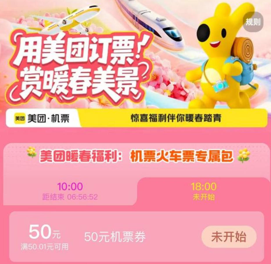 美团出行特惠:机票立减50元/火车立减15元,手慢无