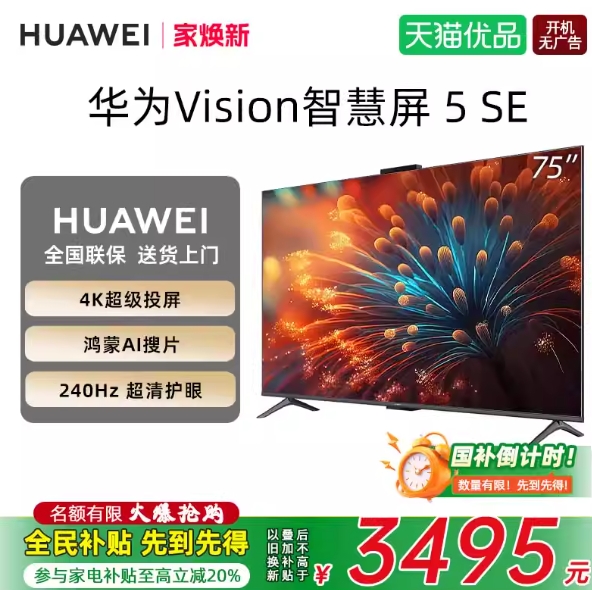 2933.81元包邮白菜价!华为 Vision 智慧屏 5 SE Mini LED 75英寸平板电视