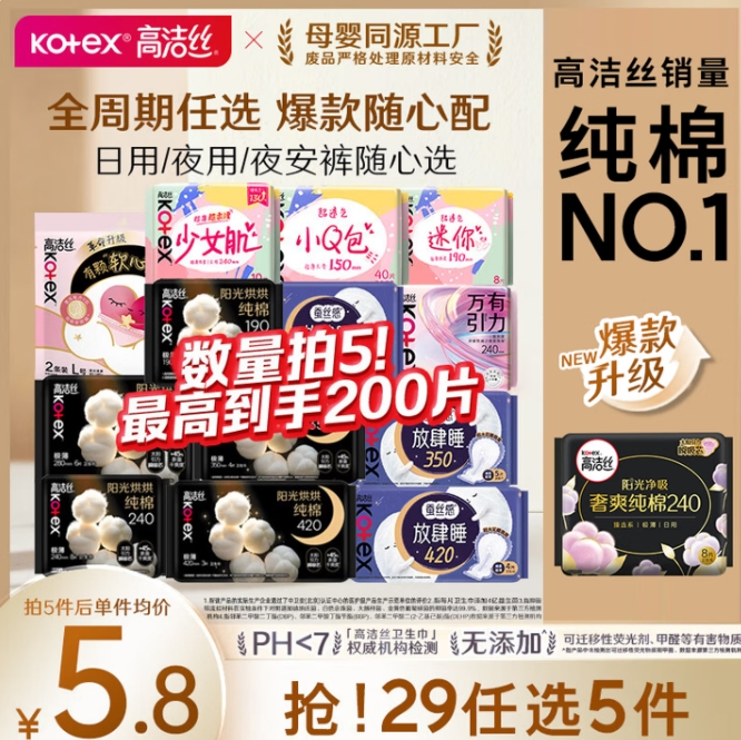 高洁丝 超薄透气日夜用卫生巾2~40片/包,任选5件25元!