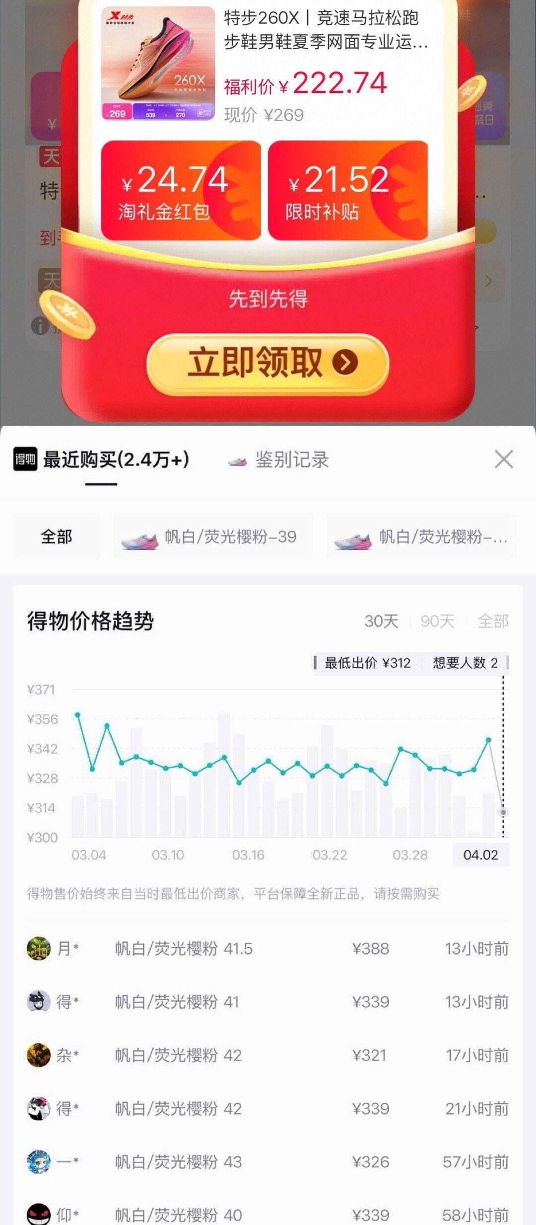 特步260x领礼金直播间闪降:购物金到手价210元,得物售价339元
