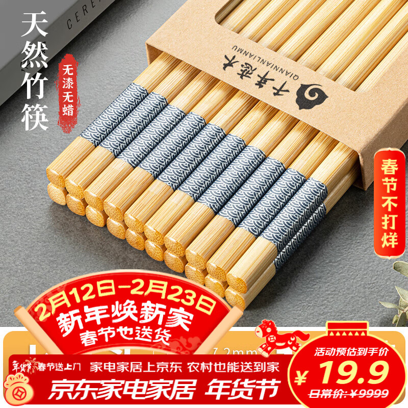千年恋木筷子限时特惠!9.95元起抢防霉防滑10双装,先领五折券再下单!