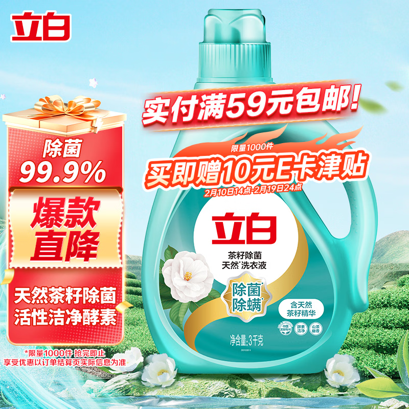 立白天然茶籽洗衣液6斤装拍2件38.8元!赠20元购物津贴