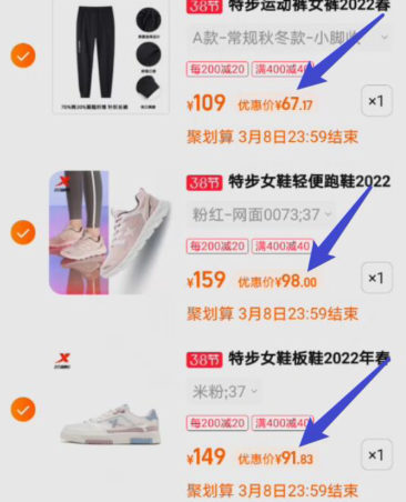 上方商品加入购物车,叠加200-20元促销,领取标题下400-40元优惠券,折合运动裤到手67元,2款女板鞋分别到手98元和91元。限时价,活动时间20-24点