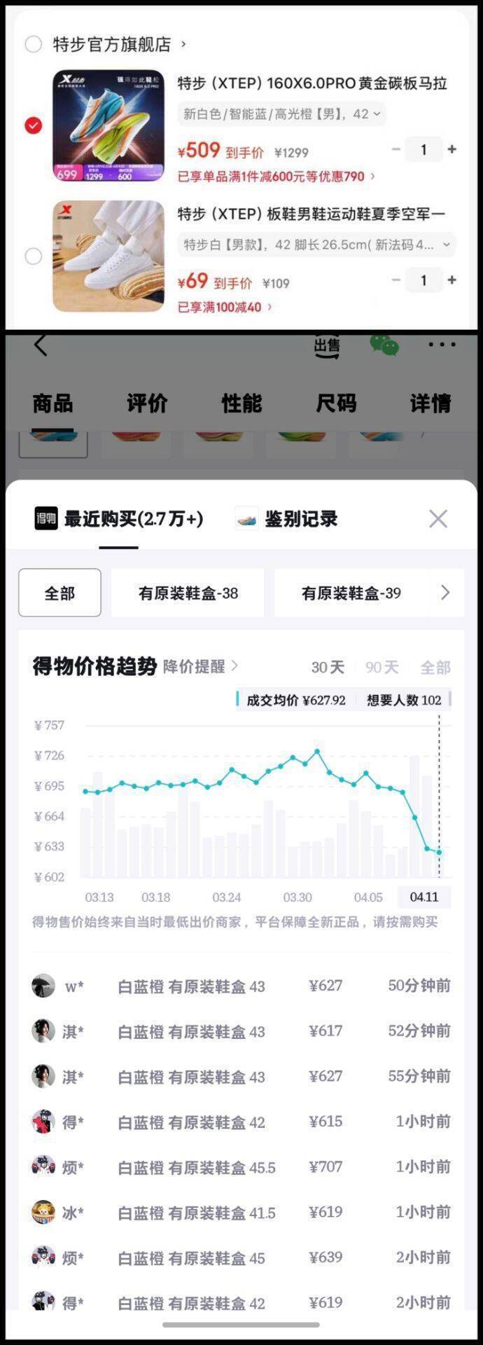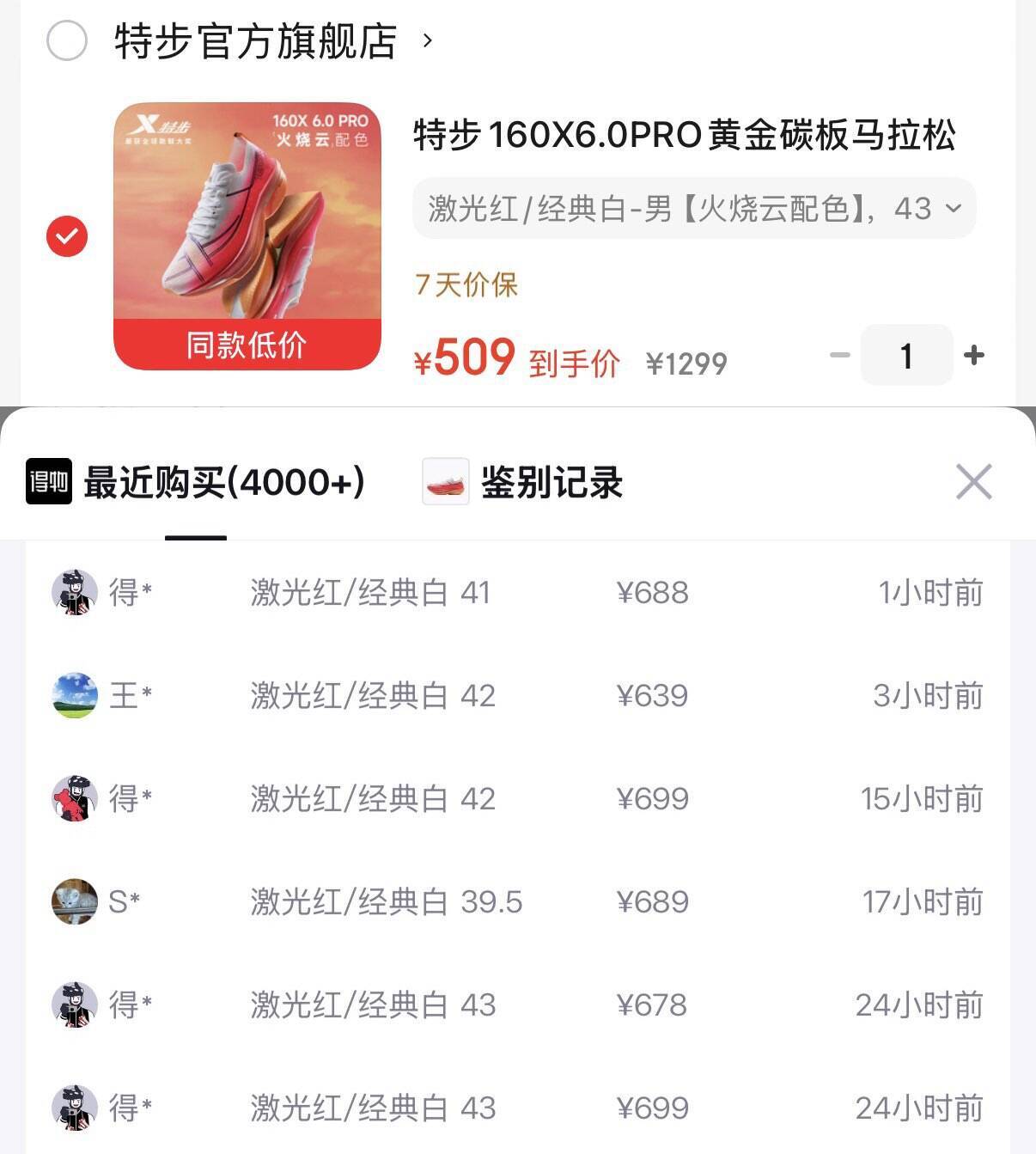 特步160X6 Pro 购物金到手价468元,得物售价629元秒卖