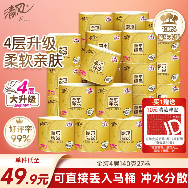 清风有芯卷纸原木金装27卷首购3元领10津贴折后26.72/件