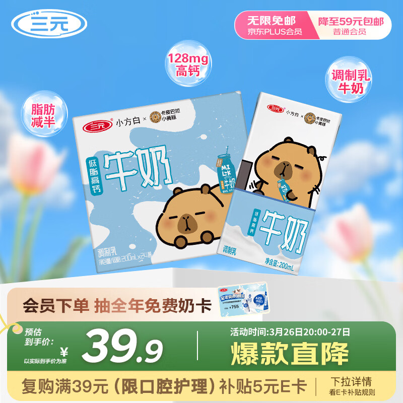 自营三元小方白低脂高钙牛奶整箱24盒,Plus叠首购仅需30.22元