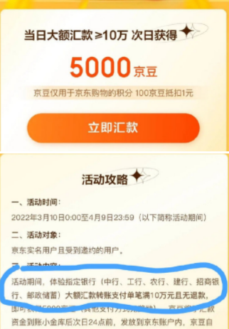 【京东】京东金融app-小金库,如有10个W,部分招行体验完成10万转账奖励5000京豆