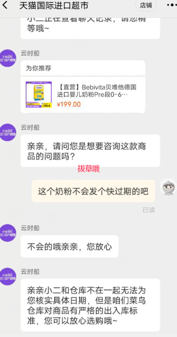 小编问了客服,关于奶粉有效期问题,回答说是不会发快过期的:
