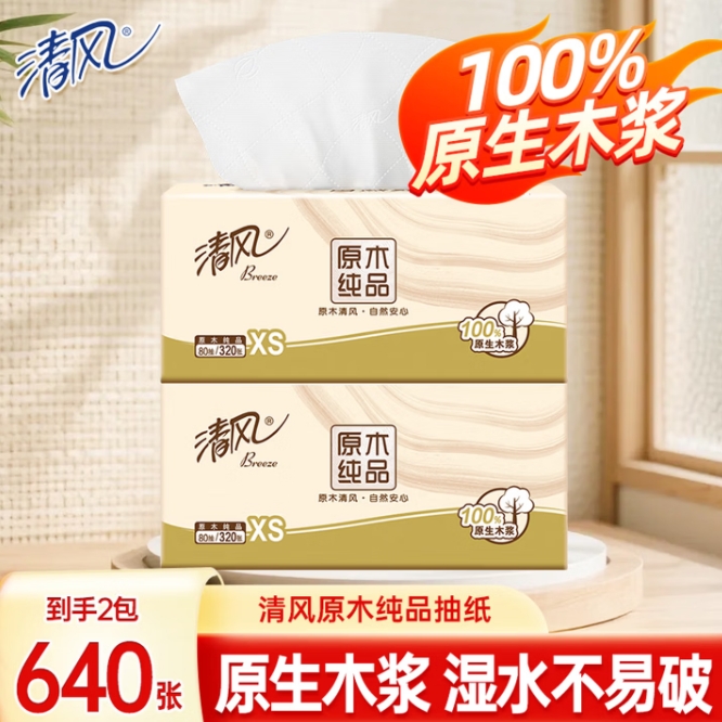 0.9元!清风抽纸4层 320张*2包