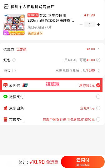 现售价11.9元,领1元券,京喜App下单,选择云闪付支付再减5元,京喜App付款实付5.9元包邮;包括:230mm的20片,290mm的7片;