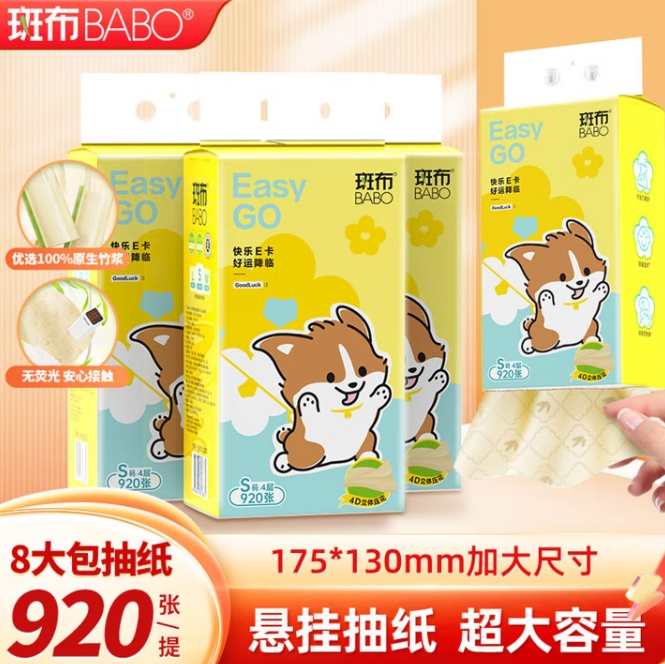 20.9元包邮!斑布·悬挂式抽纸8提