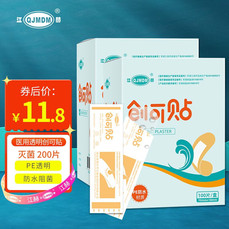 江赫(QJMDM)医用创可贴防水阻菌防磨脚后跟透气医用消毒创口贴止血贴 【2盒 200片】透明防水款