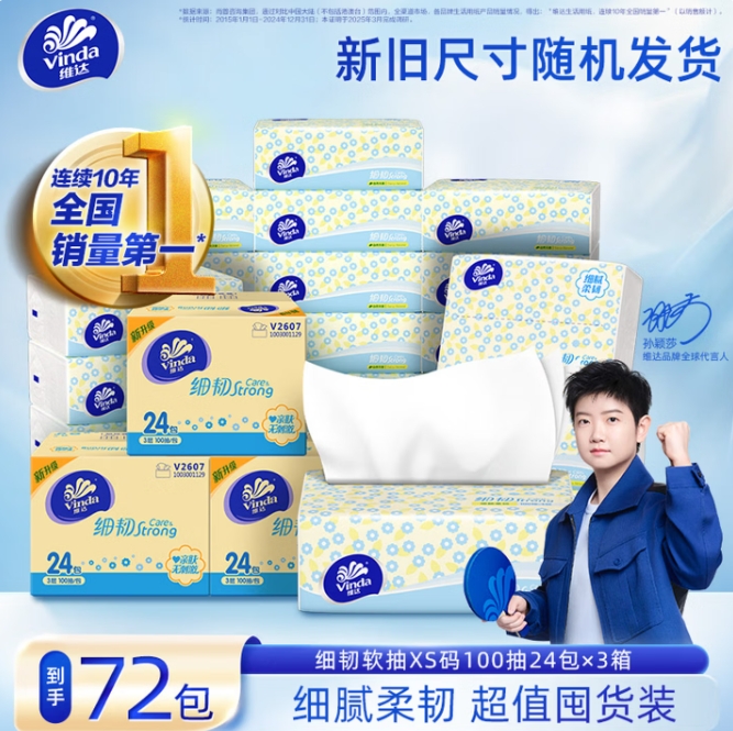 68.7元包邮!维达 细韧系列 抽纸 3层100抽*72包