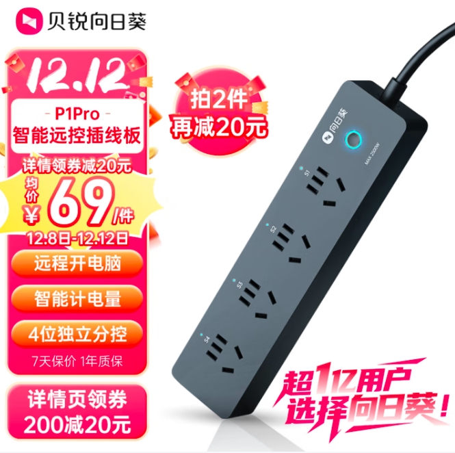 57.9元!贝锐向日葵 P1pro排插智能插线板