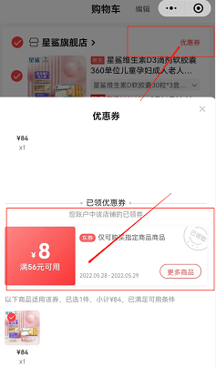 现售价84元,领28元券,加入购物车后年,京喜APP付款,在京喜商品页面价格下领56-8元券,实付48元包邮+赠3盒同款,共120粒;