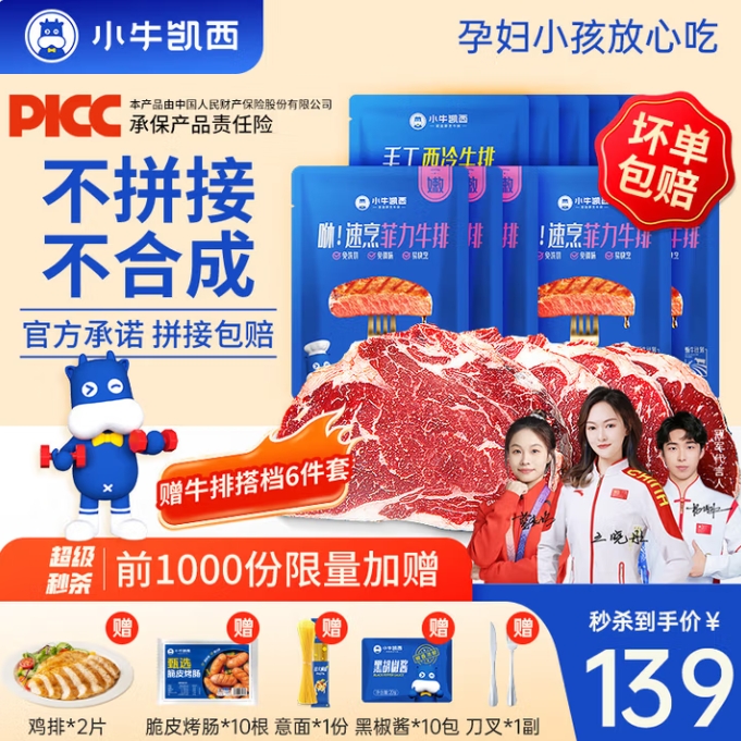 99元包邮!小牛凯西 整切牛排组合装10片+赠鸡排*2+烤肠*10根+意面