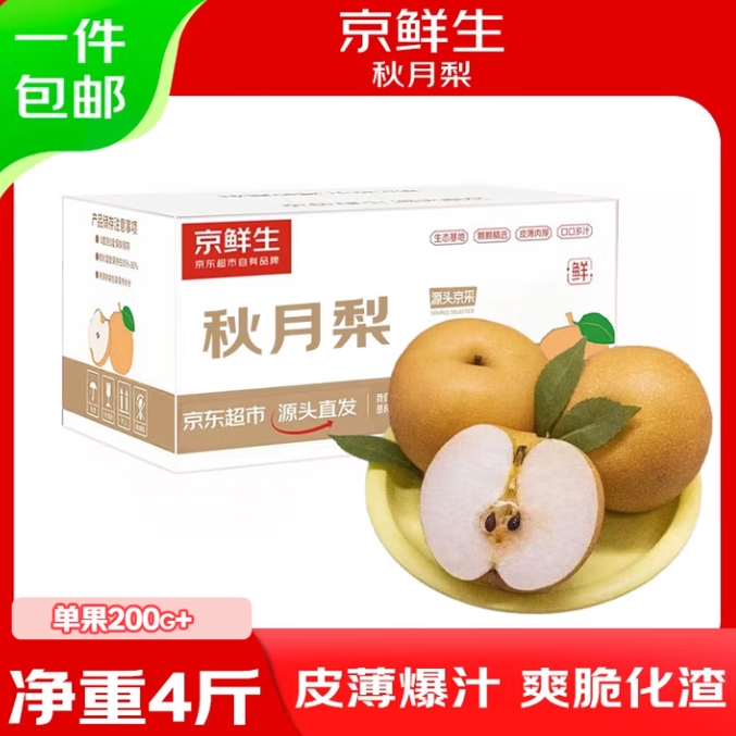 9.9元包邮!京鲜生山东烟台莱阳 秋月梨净重4斤单果200g+