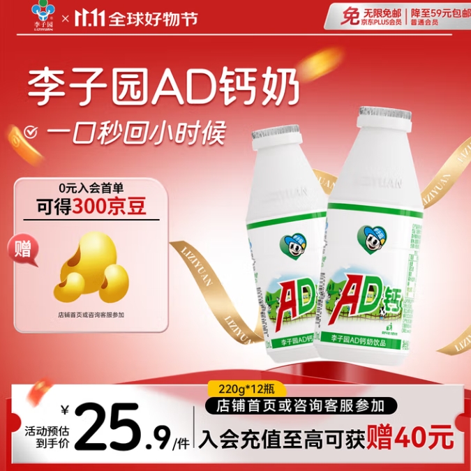 4.3元包邮!李子园AD钙奶220ml*12瓶(返10E卡后)