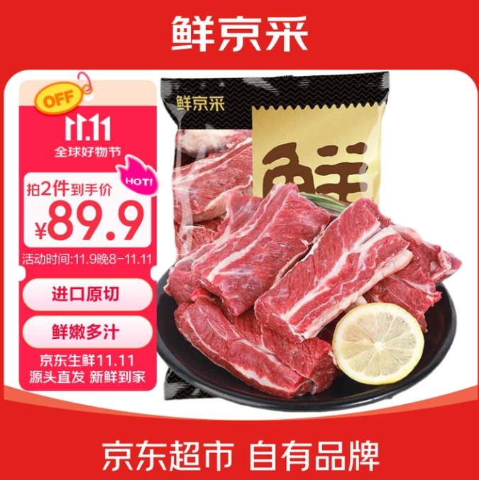 78.8元包邮!鲜京采 巴西进口原切牛肋肉2斤*2件