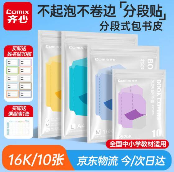 自营齐心分段式包书皮10张仅6.9元!赠10枚姓名贴,学生必备限时抢