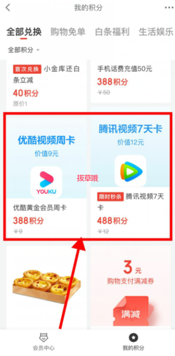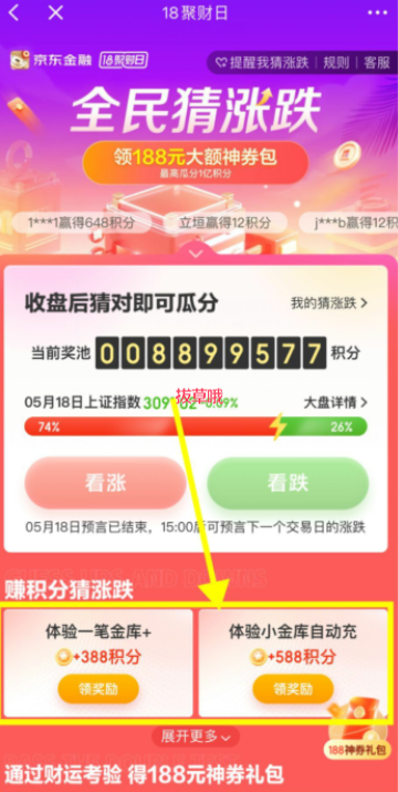 京东金融APP->首页“18聚财日”->完成“体验一笔金库+”->买入1元就行(确认份额后赎回)->领取388积分->完成“体验小金库自动充”->设置自动充->然后再取消自动充->返回页面领取588积分->返回京东金融首页->底部“我的”->我的积分->下拉兑换优酷和腾讯视频会员周卡。