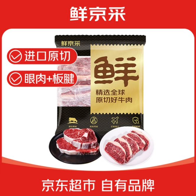 56.53元!鲜京采 巴西进口原切牛排组合2.4斤 眼肉3片+板腱3片 口粮款