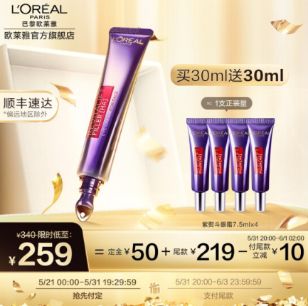 预付50元定金,31日20点支付尾款,预计259元包邮,再送7.5mL*4小支(正装量)
