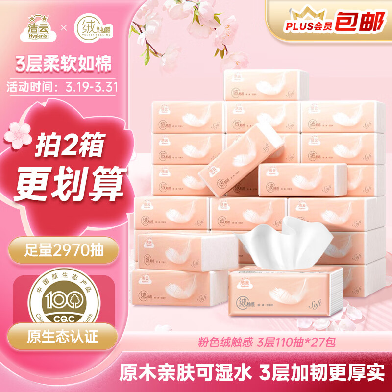 自营洁云抽纸黑五特惠:27包*3层绒触感,4件仅需111.56元