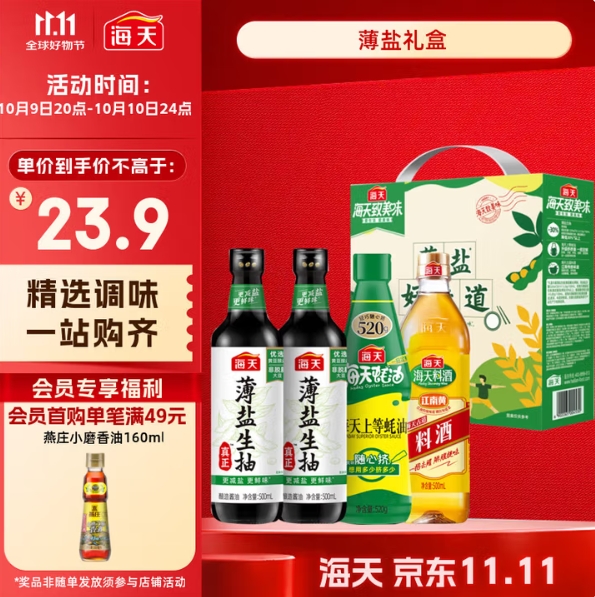 5.9元!海天 礼盒系列 生抽酱油500ml*2+ 蚝油520g+料酒500ml(返5元E卡后)