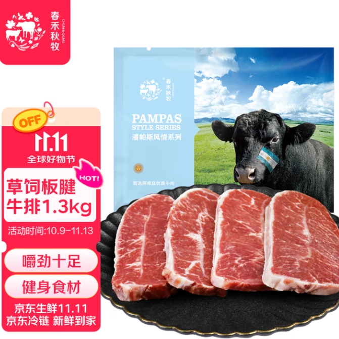 88.9元!春禾秋牧 进口原切草饲板腱牛排 1300g