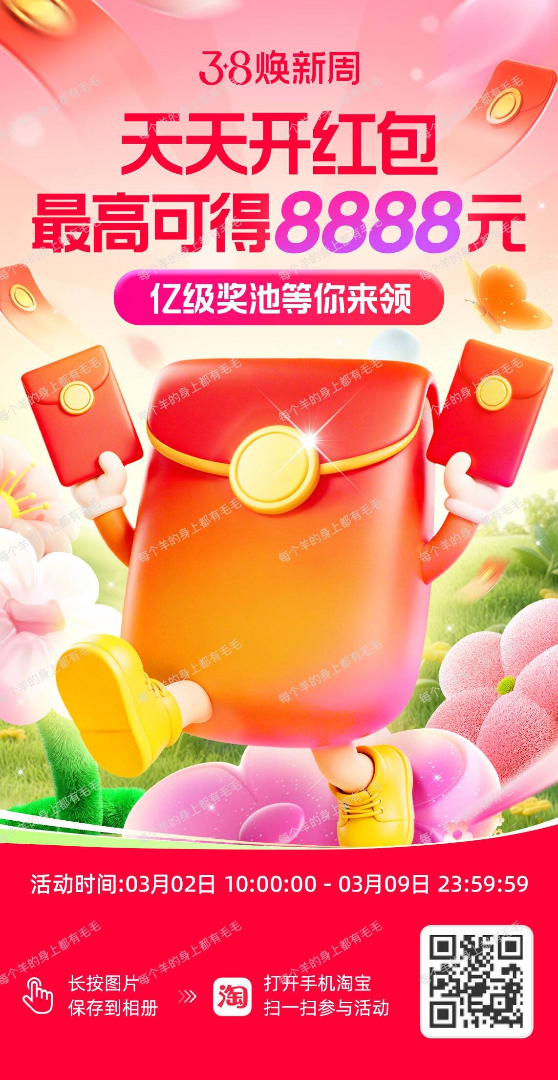 淘宝38节狂欢开启!3月2日10点抢最高8888元红包