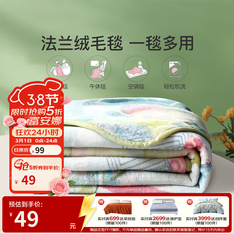 富安娜家纺五折狂欢!毛毯 49 元、羊毛被 109 元起