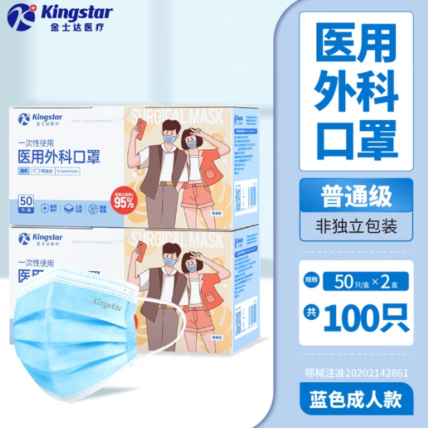 9.9元包邮!金士达 一次性医用外科口罩2盒共100只