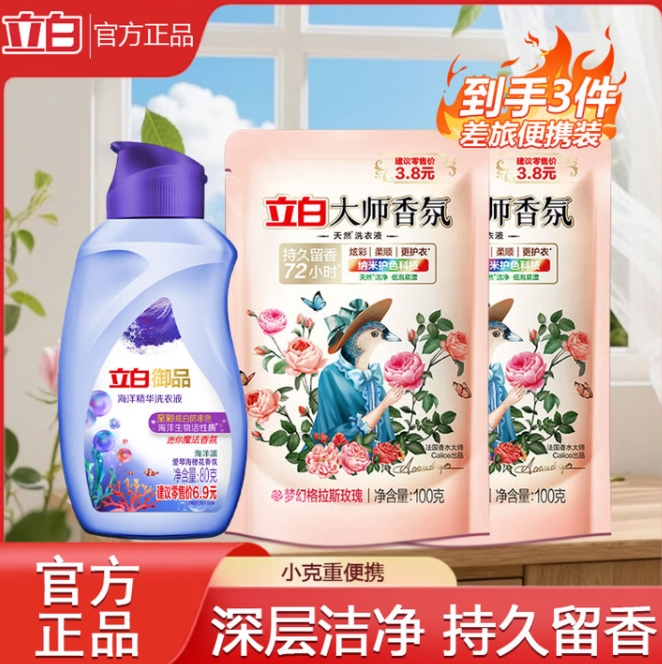 3.9元包邮!立白大师香氛 御品洗衣液80g+大师液100g*2袋