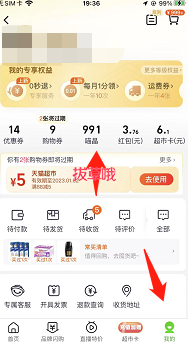 1、手淘APP-首页上方天猫超市-我的-喵晶(兑换200-12元券,如下图);