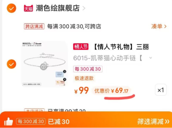 在售价99元,领20元券,叠加凑单满300-30元优惠,叠加88VIP会员95折优惠,一起付款,折三丽鸥到手69.1元;