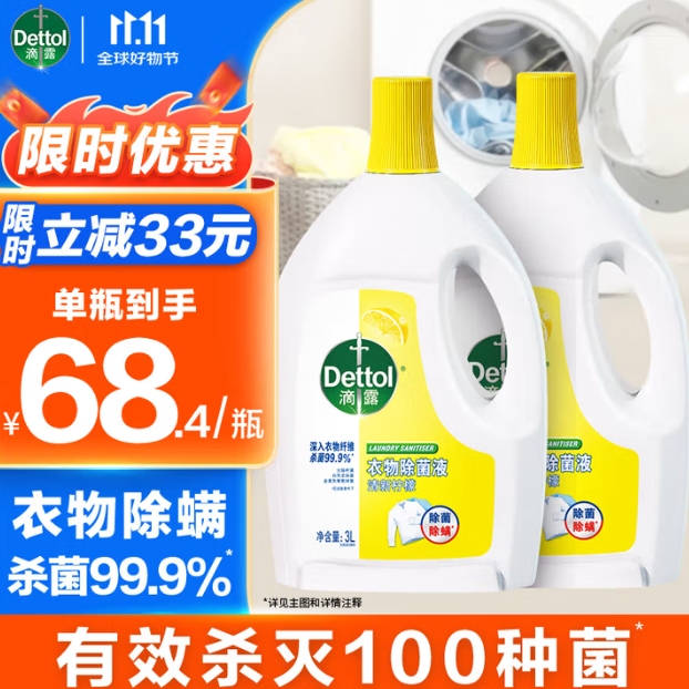 47元/瓶!Dettol 滴露 衣物消毒除菌液柠檬3L*2瓶