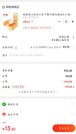 活动售价6.9元,下单5件,店铺满34-16元优惠,叠加京喜特价版百元生活费页面领取满29-5优惠券,实付13.5元包邮;