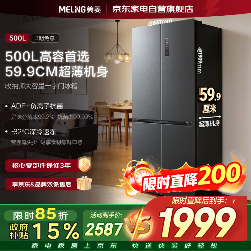 美菱冰箱500升十字四开门国家补贴9折到手价2351.99元