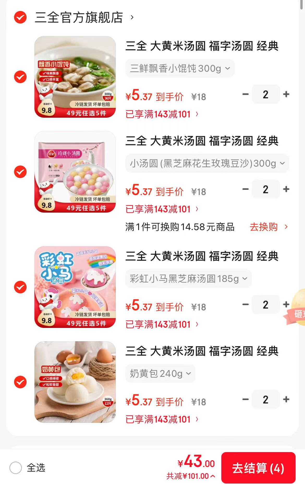 三全汤圆组合任选 8 件仅需 43 元,折合 5.3 元/件速囤!
