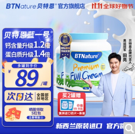 95元包邮!贝特恩蓝胖子奶粉 1kg*2罐+原味高钙奶片18g*2
