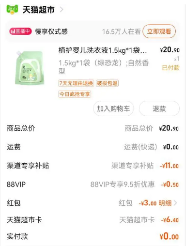 在售价20.9元,价格下拉进入今日疯抢页面-找到该商品售价9.9元,有3元福袋,88VIP下单参与满1件打9.5折优惠活动,领取3元母婴品类金,实付至3.4元包邮;