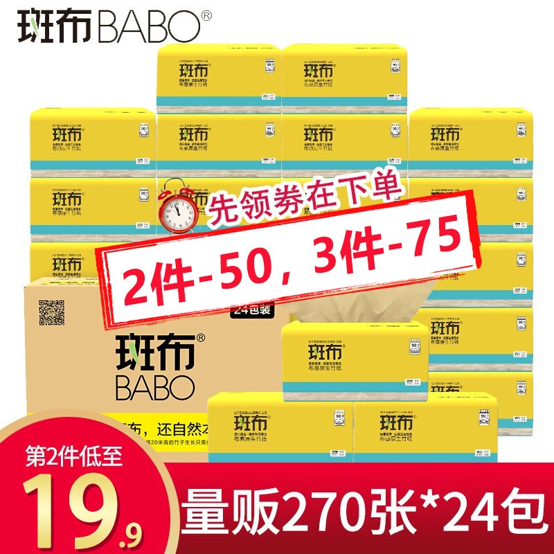 ¥39.9 斑布(BABO)本色抽纸原生竹浆竹纤维纸抽擦手面纸班布直发餐巾纸 90抽24包 69.9