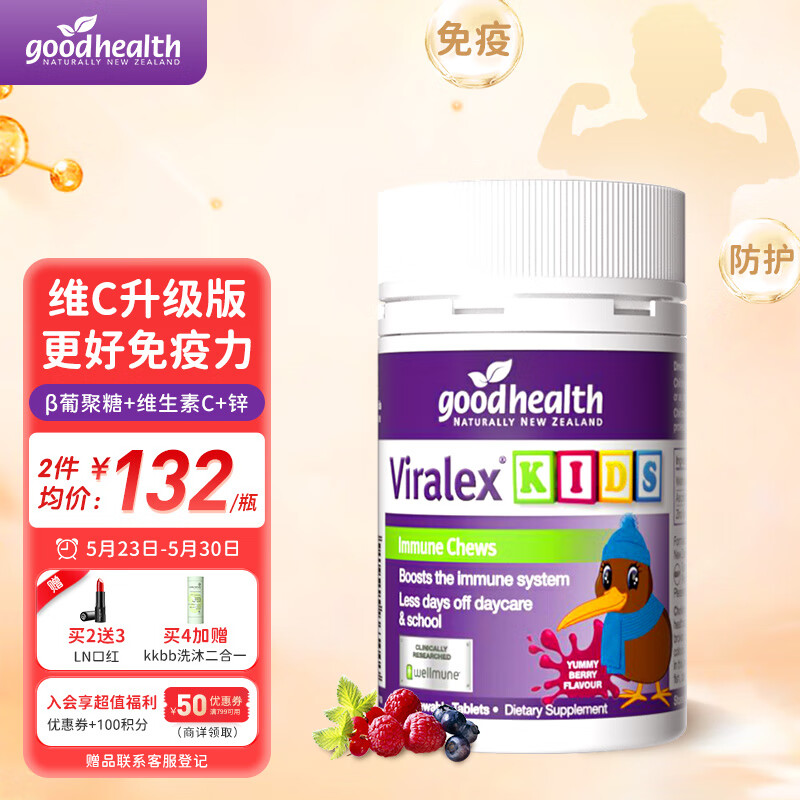 ¥138 goodhealth好健康免疫力维生素C升级版儿童婴幼VC嚼嚼乐酵母葡聚糖益生菌肠胃腹泻补锌营养新西兰进口60粒/瓶 168