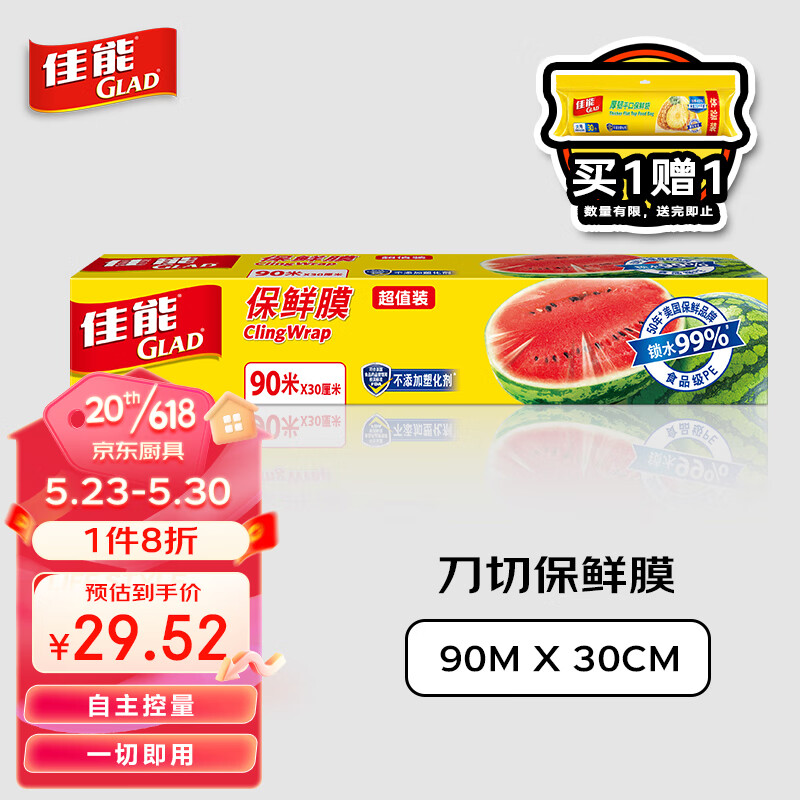 ¥34.9 佳能 Glad 保鲜膜大号90米 带切割器保鲜膜套 食品级PE 30cm大碗盒装 36.9