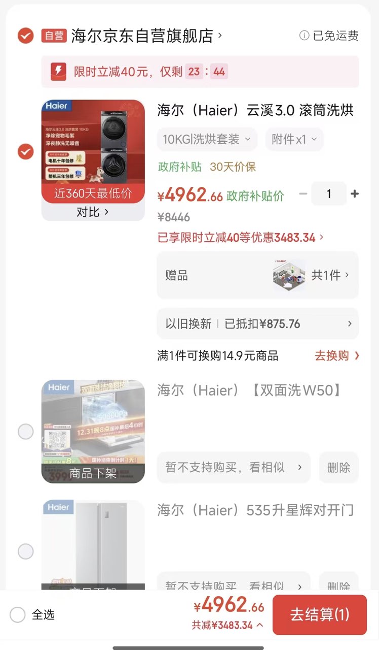 海尔云溪 3.0 洗烘套装限时特惠,到手不高于 4962 元!