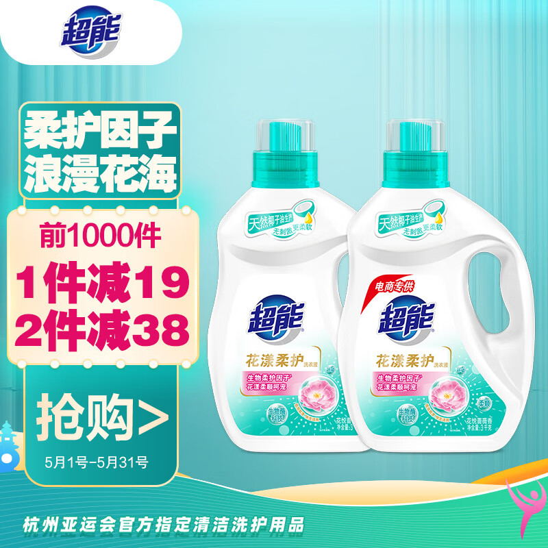 ¥63.9 超能 洗衣液3kg*2瓶 12斤家庭实惠装 去渍洁净 花漾柔护 持久留香 99.9