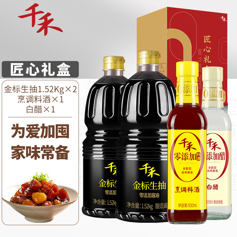¥26.9 千禾 酱油醋料酒 金标生抽1.52kg*2+白醋500ml+烹调料酒500ml 礼盒装 36.9