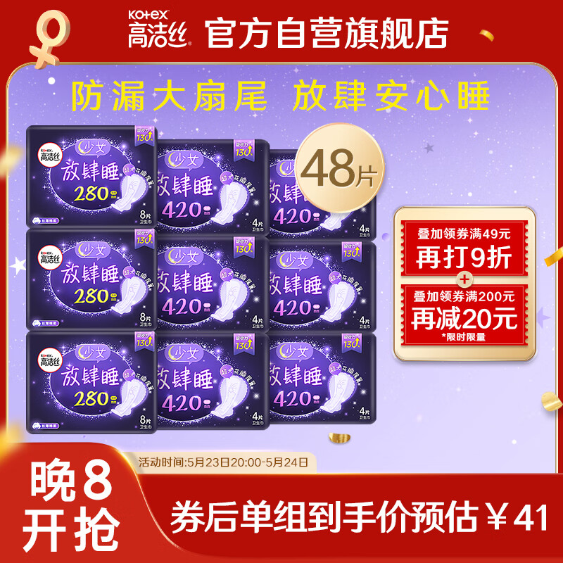 ¥44.1 高洁丝Kotex放肆睡夜用组合套装9包48片(280*24+420*24)卫生巾套装 49