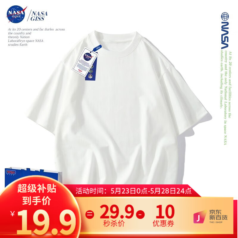 ¥19.9 NASA GISS重磅260g纯棉短袖t恤男纯色圆领厚实不透纯白打底衫男女体恤上衣 白色 L体重130-150斤 29.9